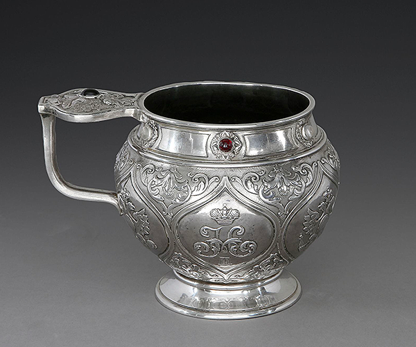 A few days earlier (December 8), also at the Hôtel Drouot in Paris, De Baecque & Associés sold what they called a silver Fabergé ‘Imperial Presentation Charka’ (Lot 147) for €26,000 against an estimate of €3,000-5,000. It wasn’t a charka – but it is a very nice object: a 10 x 14cm bowl with a handle, ringed with Imperial eagles and the crowned H II ciphers of Nicholas II, and with coloured hardstones set in to the handle and rim. The workmaster was Michael Perkhin, which dates it to 1903 at the latest.