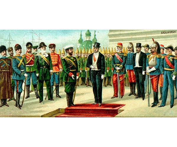 Ambassador Montebello is credited with engineering the Franco-Russian Alliance in 1897, and organizing President Faure’s visit to Petersburg to lay the foundation stone of Trinity Bridge on August 24 that year: Montebello appears above right, with red kepi and sword, on the lid of a box of chocolates immortalizing that splendiferous ceremony. Montebello is shown below left in his Embassy study; the caption reads ‘Comte de Montebello sees the policy of rapprochement and alliance, of which has been one of the leading proponents, today triumph.’