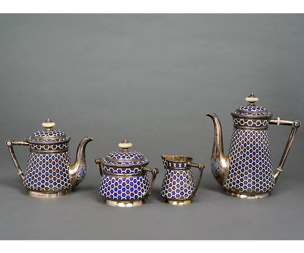 Down in Nice on 27 November 2022, a four-piece Gustav Klingert tea- and coffee-service (Moscow 1880s) roared to a premium-inclusive €66,976 at Boisgirard-Antonini against a slightly stingy €6,000-7,000 estimate (Lot 132). Silver spouts, and silver/ivory knops and ‘Etruscan’ handles, provided a sober contrast to the items’ honeycomb patterning in blue, white and champlevé red enamel. Klingert is not a big name like Fabergé: he was just a good, solid maker – a bit of a mass-producer not known for any masterpieces, and he used this honeycomb pattern many a time. So the price here was a bit astonishing: €67,000 for such a common design seems way over the top. Yesteryears, Welcome Back!