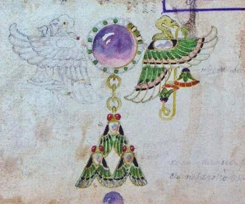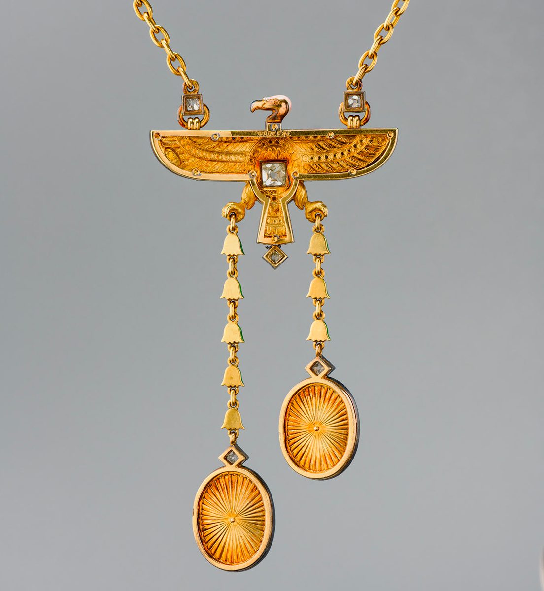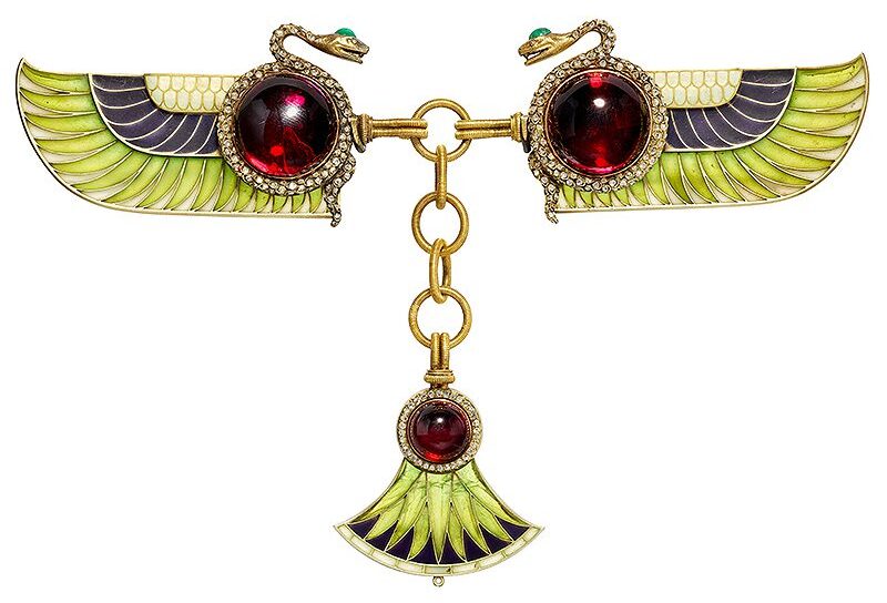 It takes the form of wings and tail-feathers in green, white and midnight blue enamel, linked by a gold chain and set with blood-red garnet cabochons ringed by tiny rose-cut diamonds. Two snakes, symbolizing the Egyptian cobra goddess Wadjet, protrude from the rims of the upper cabochons sporting natty emerald caps. The clasp bears the ЯА hallmark of St Petersburg’s Hjalmar Armfeldt.