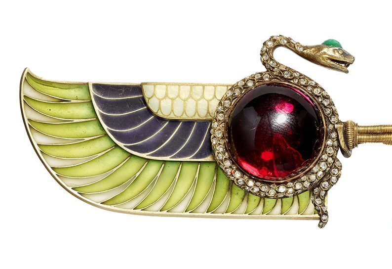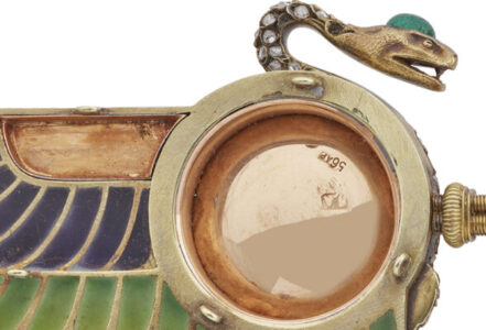 Korneychuk, however, underestimates the popularity of the Egyptian Style amongst Fabergé’s St Petersburg craftsmen. Apart from Hjalmar Armfeldt – the maker of our Cape-Clasp – their number also included the illustrious Henrik Wigström, whose gold necklace incorporating an enamel and diamond vulture, with two turquoise scarab pendants dangling from its talons, surfaced at Genève Enchères on 13 December 2016, selling for CHF75,000 (around $105,000 in today’s money). Had the auctioneers not misidentified the vulture as a ‘falcon’ it might have flown even higher.