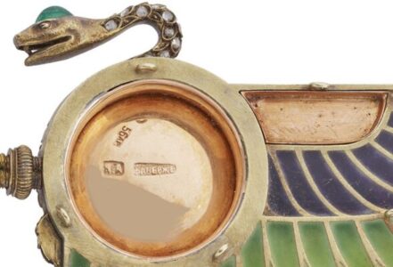 Korneychuk believes the designs were inspired by a gold pendant necklace discovered in the tomb of Queen Ahhotep (16th century B.C.) by the French Egyptologist Auguste Mariette, and shown at the Paris Exposition Universelle of 1878. Many French jewellers subsequently produced items aesthetically indebted to Ancient Egypt – but the style was ‘almost completely neglected’ by Russian jewellers apart from Fabergé, reports Korneychuk. Even so, ‘Fabergé’s interest seems modest. Among the thousands of objects produced by the firm it has scarcely proved possible to identify two dozen in Egyptian style.’ She believes this ‘cautious attitude’ reflects the fact that the imagery of Ancient Egypt was associated with Freemasonry – banned in Russia from 1822-1905.