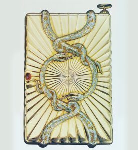 Interestingly, Henrik Wigström and Hjalmar Armfeldt shared a liking for Egyptian-looking snakes. Armfeldt was the author of a lozenge-shaped purpurin dish, with silver snake slithering around the rim, sold at Sotheby’s Geneva in May 1993. Wigström embellished a gold cigarette case made for Princess Cécile Murat in 1911 with intertwining platinum snakes.