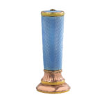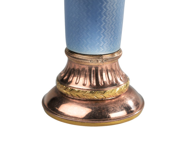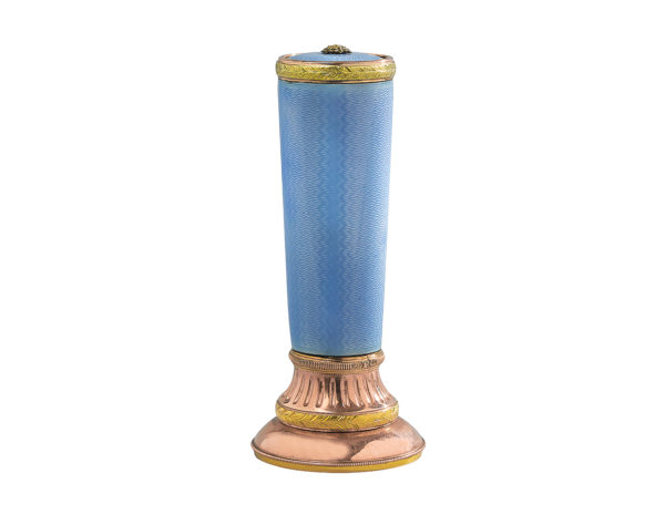 A gold desk seal of tapering cylindrical shape, enamelled in translucent powder blue over a guilloché ground, with a two-colour gold collar chased with foliate bands and fluting, surmounted with a floral terminal.