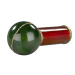 A ball-shaped nephrite parasol handle set with a row of rose-cut diamonds and two larger collet diamonds, supported on a cylindrical stem enamelled in translucent red over a moiré guilloché ground, the gold bezels chased with acanthus leaves.