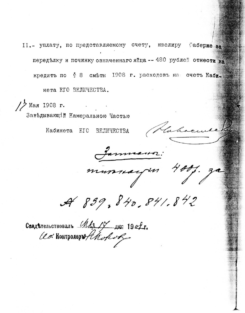Иванов не раскрывает, каким образом ему удалось найти никому не известные документы, и каково их происхождение. Ни названия архива, ни номера фонда, описи, дела или страницы он не приводит. Однако, зная, что соответствующие фонды находятся в Российском государственном историческом архиве (РГИА), я решил проверить наличие там таких документов. Никаких счетов ни на изготовление, ни на починку яйца 1904 года там обнаружено не было. Вот, например, листы из дела 468-8-953 “О закупке от ювелиров драгоценных вещей в Кабинет” за 1908 г., упоминаний о починке яйца в них нет.