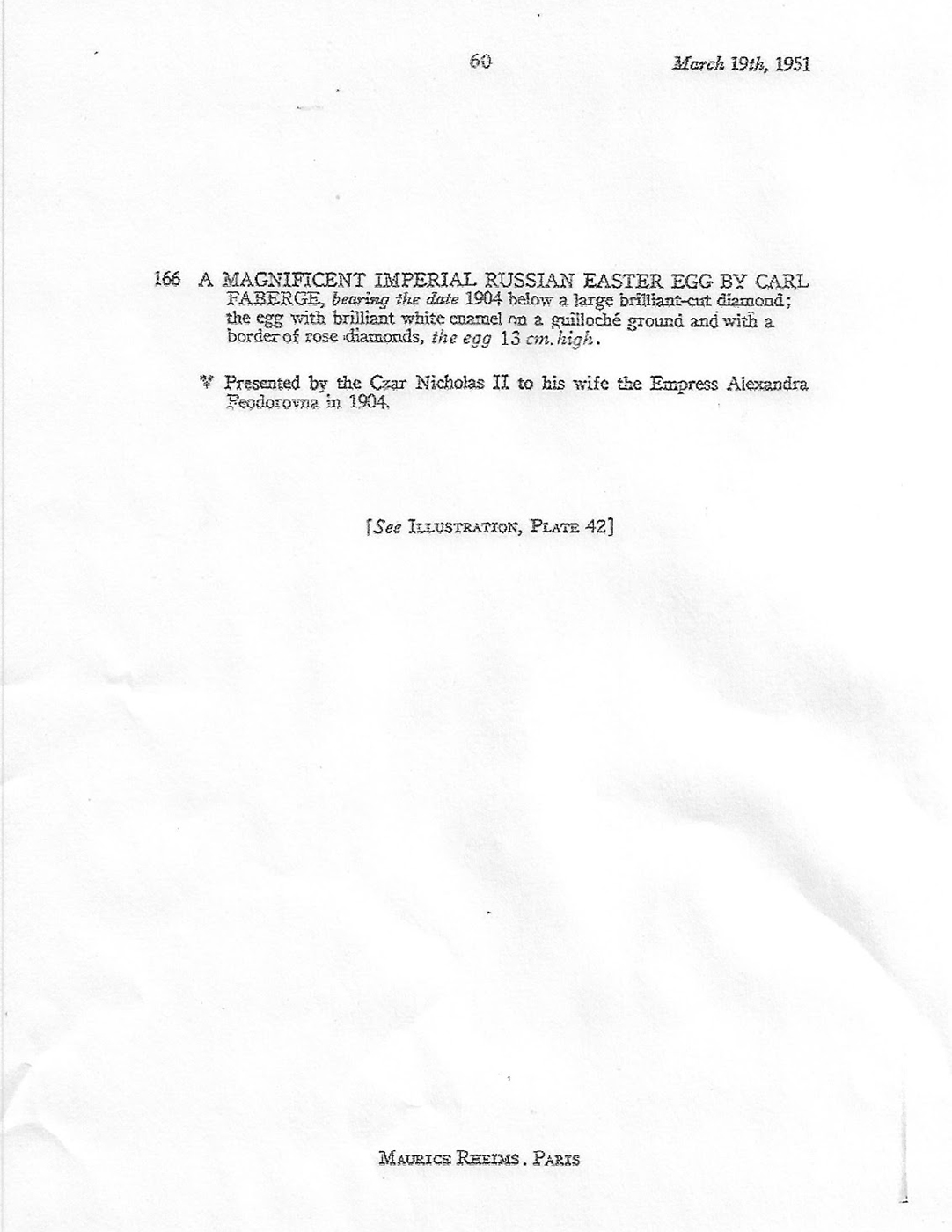 Я обнаружил, что единственный аукцион Мориса Реймса в этот день был посвящен старым коврам. Не стоит уточнять, что в его каталоге никакого яйца Фаберже нет и в помине. Чтобы окончательно убедиться, что ссылка на каталог подложная, я обратился в архив Hôtel Drouot, откуда получил подтверждение, что “великолепного императорского пасхального яйца Фаберже” в марте 1951 года они не продавали.