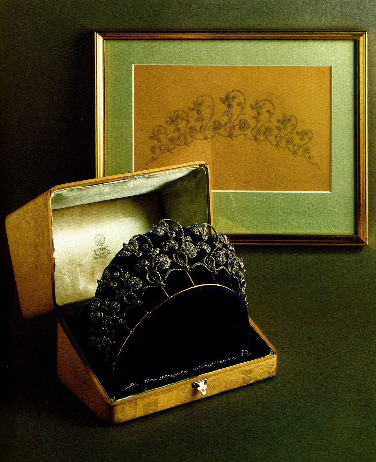 The public is less familiar with Fabergé jewellery than with Fabergé eggs. Fabergé jewellery consisted essentially of fairly simple, albeit elegant, low-cost items: brooches, cuff-links, pendants and, less frequently, bracelets and necklaces. Such pieces are often to be found in the catalogues of Sotheby’s and Christie’s Russian Sales. Fabergé also created more expensive jewellery but, as Marina Lopato noted, only a few such items have survived to this day, and most appear irretrievably lost (M. Lopato: The Jewellers of Old Petersburg – St Petersburg 2006, p. 166). The survivors include eight tiaras: six of them indisputably by Fabergé, two of them attributed to Fabergé. All eight left Russia prior to the Revolution – either as imperial gifts, or sold through Fabergé’s London branch – and are now in European aristocratic collections. There are no Fabergé tiaras in any Russian collection.