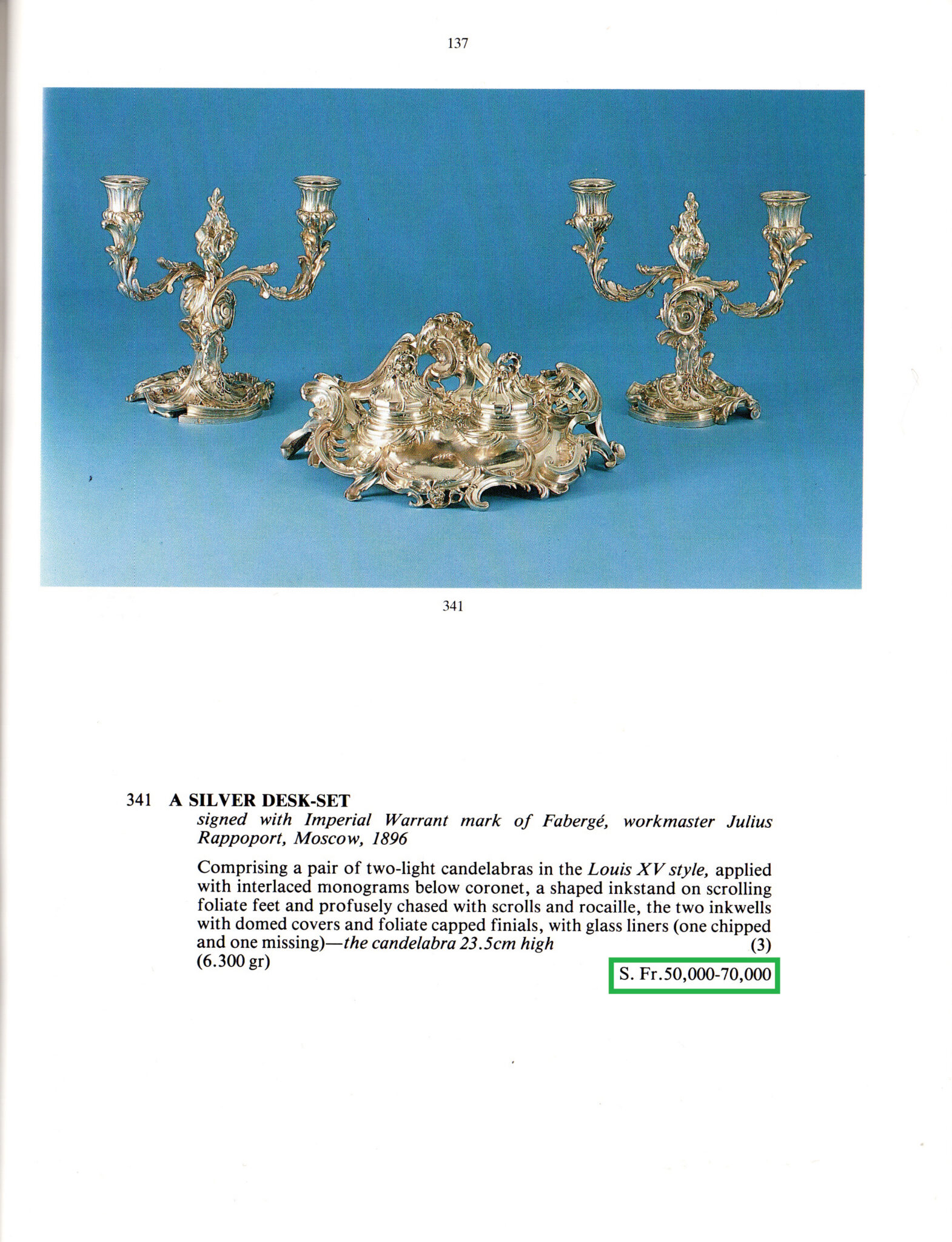 A silver inkstand and a pair of candlesticks of Rococo design, comprising a stand, sand-box and inkwell the stand of openwork outline standing on scroll feet, chased overall with rocaille scrolls and flowers; the candlesticks on shaped circular foot, cast and elaborately chased with spiral scrolls and rocaille, the vase-shaped stem and sockets similarly chased. The inkstand signed Fabergé beneath the Imperial Warrant.