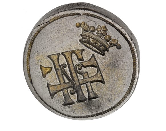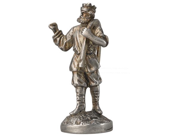 Silver seal shaped as a figure of a standing moujik with a yoke over his left shoulder, standing on a domed circular base; the matrix is engraved with crowned monogram.