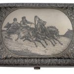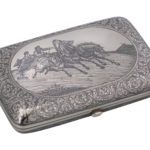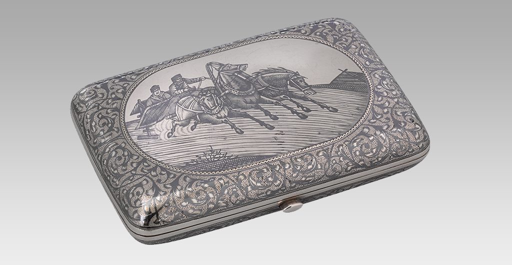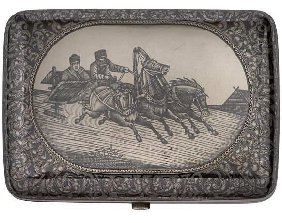Nielloed silver cigar case, the cover with a troika in a winter landscape in an oval reserve, surrounded by dense scrolling foliage.
