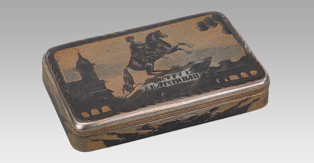 Silver-gilt hinged snuff box, decorated with niello throughout. The top of the box shows Falconet’s Peter the Great Equestrian Statue. The rock underneath carved with an inscription ‘To Peter I from Ekaterina II’. The bottom and the sides are decorated with military trophies.
