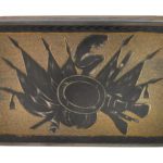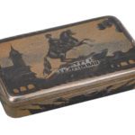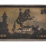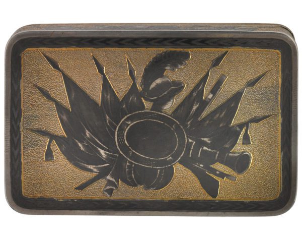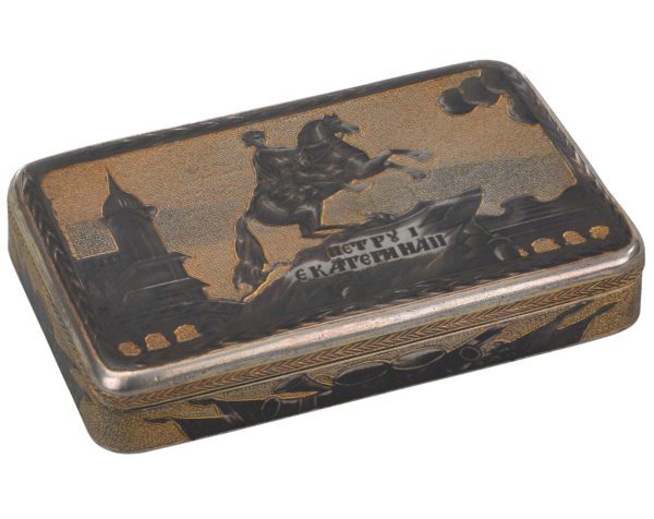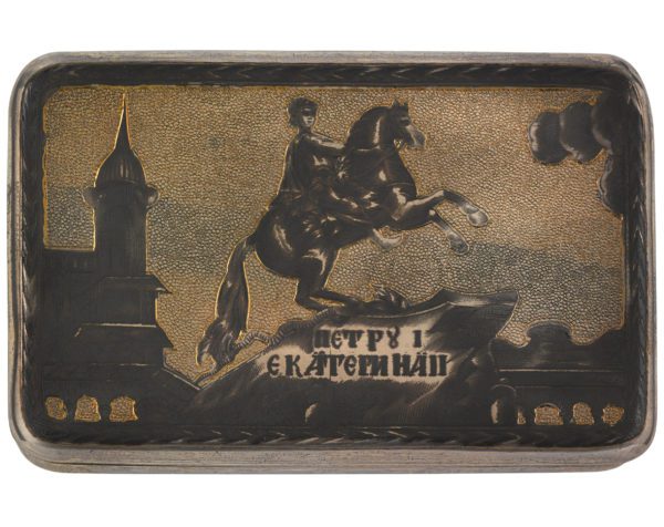 Silver-gilt hinged snuff box, decorated with niello throughout. The top of the box shows Falconet’s Peter the Great Equestrian Statue. The rock underneath carved with an inscription ‘To Peter I from Ekaterina II’. The bottom and the sides are decorated with military trophies.