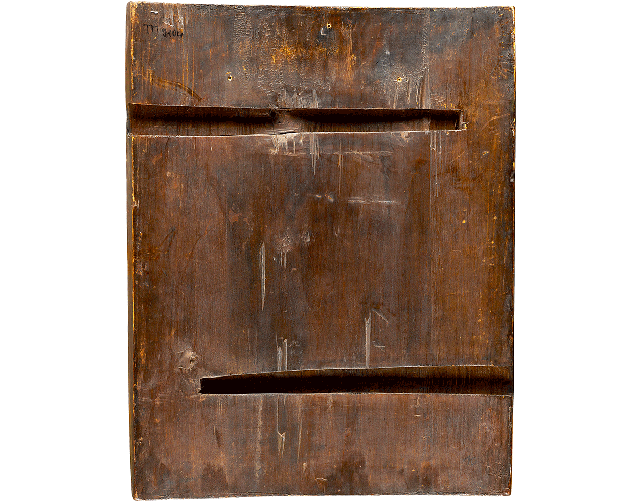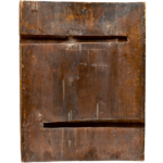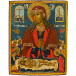 The central part of the composition is dominated by a monumental figure of the Virgin Mary with her hands clasped in prayer. Her long hair falls loosely on her shoulders only partly covered by her burgundy red maphorion. In front of her is an open sarcophagus with the dead body of Christ; on the sides are Saints Joseph and Nicodemus bent over Christ’s body and surrounded by angels witnessing the scene. The medallions in the upper corners show Aram Christi or the instruments of Christ’s Passion: a cross, a crown of thorns, a lance, a reed, a chalice, dice and a ladder.