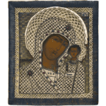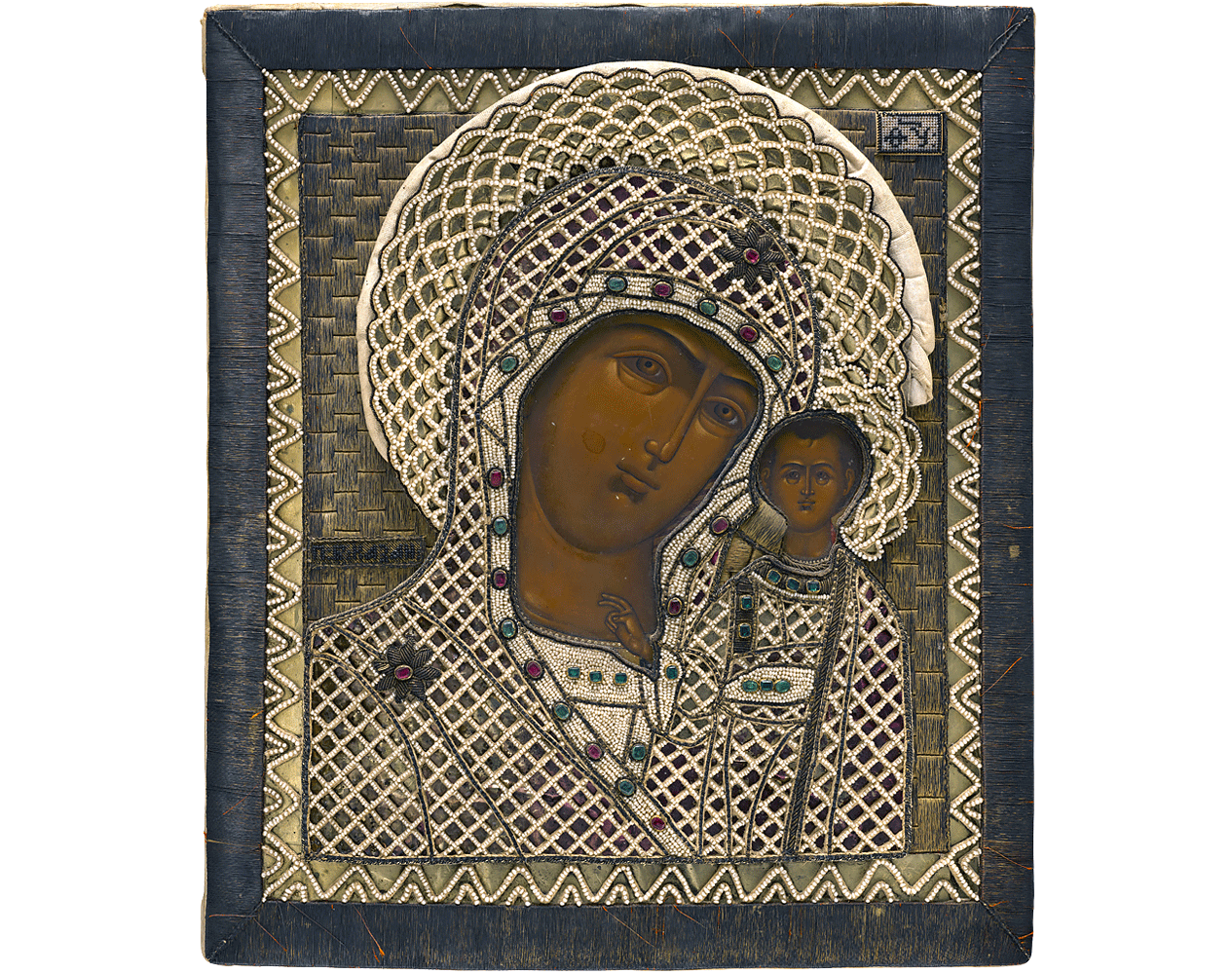 A traditionally painted icon of Our Lady of Kazan covered by a gilt threaded embroidered oklad decorated with seed-pearls, silver foil, and red and green cut stones. The Virgin is depicted bust-length with her head slightly inclined towards Christ Child standing frontally at her left.