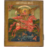 The traditionally painted icon portrays Archangel Michael as Archistrategos – the chief heavenly warrior, who defeats the Antichrist. Winged and crowned, he is shown riding across the sky on a winged red rearing charger, blowing on a trumpet and swinging a censer announcing the Last Judgment. St Michael wears a suit of armour, in his left hand he holds a closed Book of Gospels – a symbol of the fulfilment of the New Testament; his arms are spread wide apart, between them is a rainbow. With the lance in his right hand the Archangel transfixes the satan shown as a grotesque evil creature with a long tail appearing amidst stylized and sinking buildings – a symbol of Babylon. Above the scene, from the top left corner amid cloud scrolls appears Christ Emmanuel.