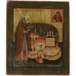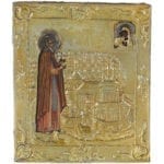A traditionally painted icon encased in a silver-gilt engraved and repoussé oklad with niello halos and rococo cartouches chased around the border. The icon depicts the Orthodox saint Nil Stolbensky, the monk saint, who established his hermitage on Stolobny Island in Lake Seliger in the mid-1500s. St Nil is shown as an elderly man with short grey hair and a long beard. He wears a simple monastic cape; his hands are raised in supplication to the Mother of God and Christ Child which appear to the top-right corner of the image. The background depicts the monastery founded by the saint.