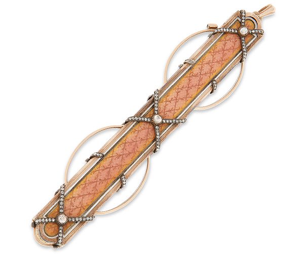 A circular Photo Frame comprising three pink ‘arms’ with sunburst engine-turning, and three white ‘arms’ with chevron engine-turning, scored CHF 69,850 (Lot 1501, est. CHF 15,000-25,000). It was purchased in St Petersburg by Nikolai II’s younger brother Grand Duke George Alexandrovich in 1897, and came with a fitted Wartski case. Sotheby’s claimed, perhaps with potential clients in mind, that the clock was ‘in the form of a Star of David.’ Hey, come on! The idea of a Russian aristocrat buying a ‘Jewish-looking’ frame or a clock is preposterous! According to Sotheby’s, Grand Duke George may have bought this frame ‘due to an admiration of a highly similar frame owned by his ‘uncle’ [sic] Nicholas II a couple of weeks earlier.’ No chance! Nicholas II and his family were fervent anti-Semites!