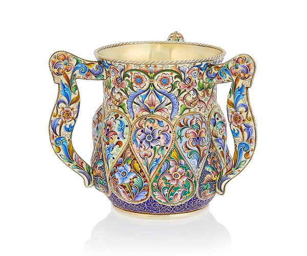 A silver-gilt and cloisonné enamel Three-Handled Cup by Rückert, 13.3cm tall, made $38,400 as anticipated (Lot 547). An engraved inscription underneath revealed that it was presented by a Doctor and Mrs Polk to Doctor and Mrs Hamlen on 21 November 1904. A silver and champlevé enamel Ovchinnikov Casket (1884), 8.9 x 12 x 6.7cm, with domed lid and velvet interior, claimed a triple-estimate $25,600 (Lot 504).