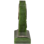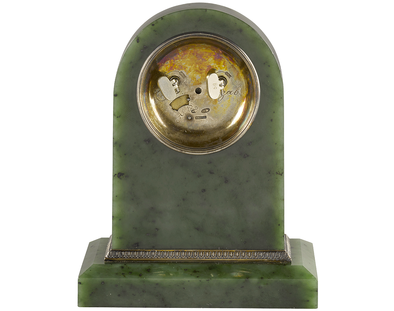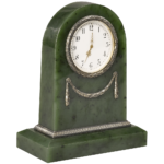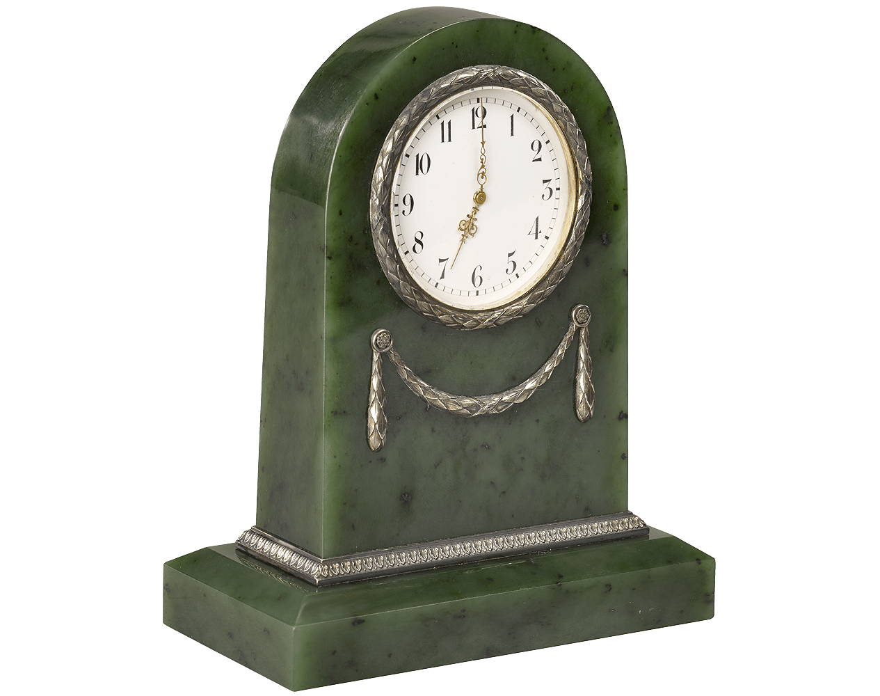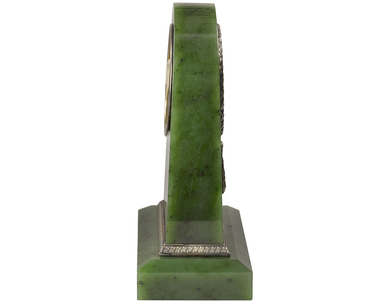Silver-mounted nephrite desk clock with arched top standing on a rectangular base, decorated with a foliate silver band, centred by an opaque white enamel dial with Arabic chapters set with a laurel wreath bezel.