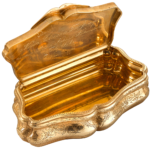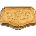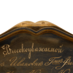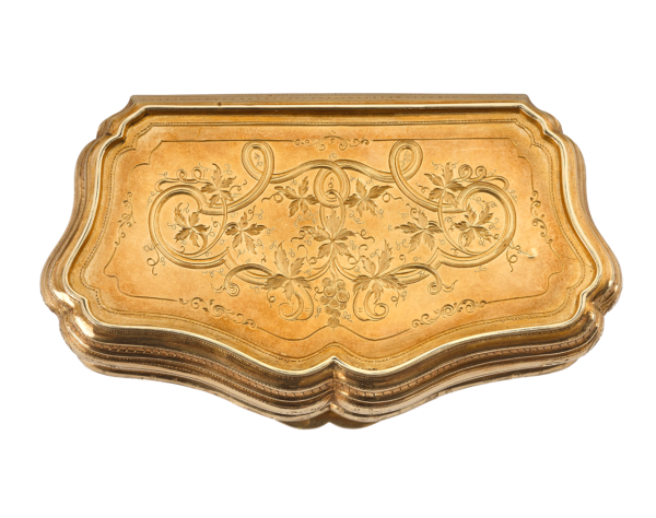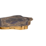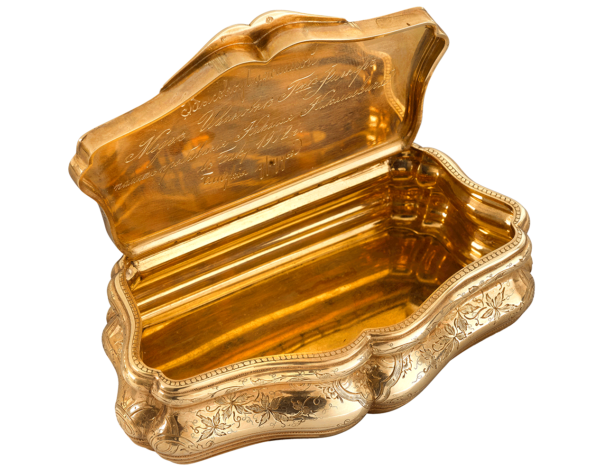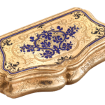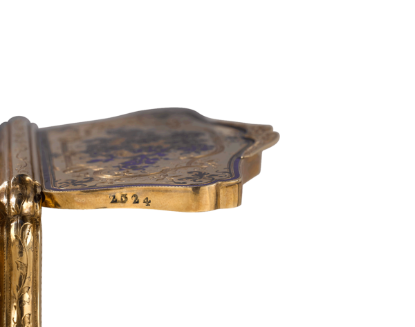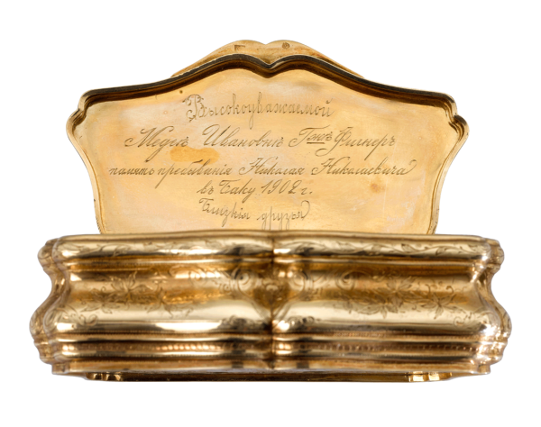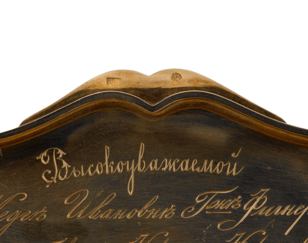 А cartouche-shaped gold snuff-box with baluster sides and a raised foliate thumbpiece, overall engraved with foliate scrolls, the lid decorated with scrolls parcel-enamelled in translucent blue and opaque black, the interior of the lid engraved with a presentation inscription in Russian: “To highly esteemed Medea Ivanovna Mrs Figner in memory of the visit of Nicholai Nicholaievich to Baku 1902. / closest friends.”