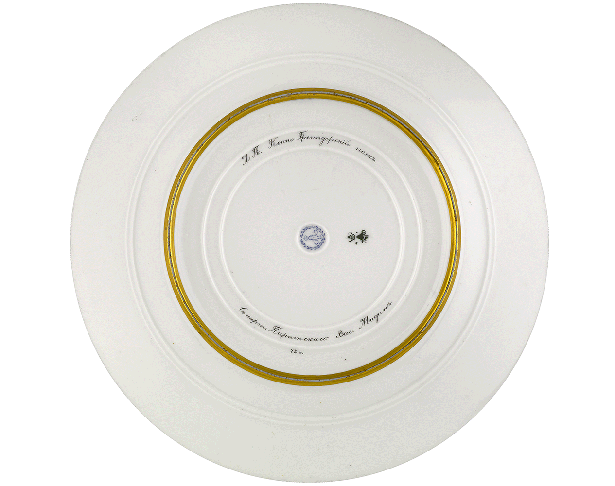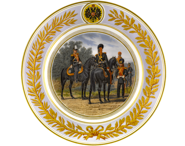 A circular porcelain military plate, the cavetto painted with troops of the Life-Guard Cavalry Grenadier Regiment by Vasily Midin after a painting by Karl Piratsky within a gilt border, the rim decorated with a gilt ciselé laurel and oak leaf wreath on a mauve ground, the top of the plate decorated with a Russian double-headed eagle within a yellow reserve. The reverse inscribed in Italics in Russian: Л.Гв. Конно-Гренадерский полк / С карт. Пиратского Вас. Мидин / 72 (Life-Guard Cavalry Grenadier Regiment / After a painting by Piratsky by Vas. Midin / 72).