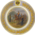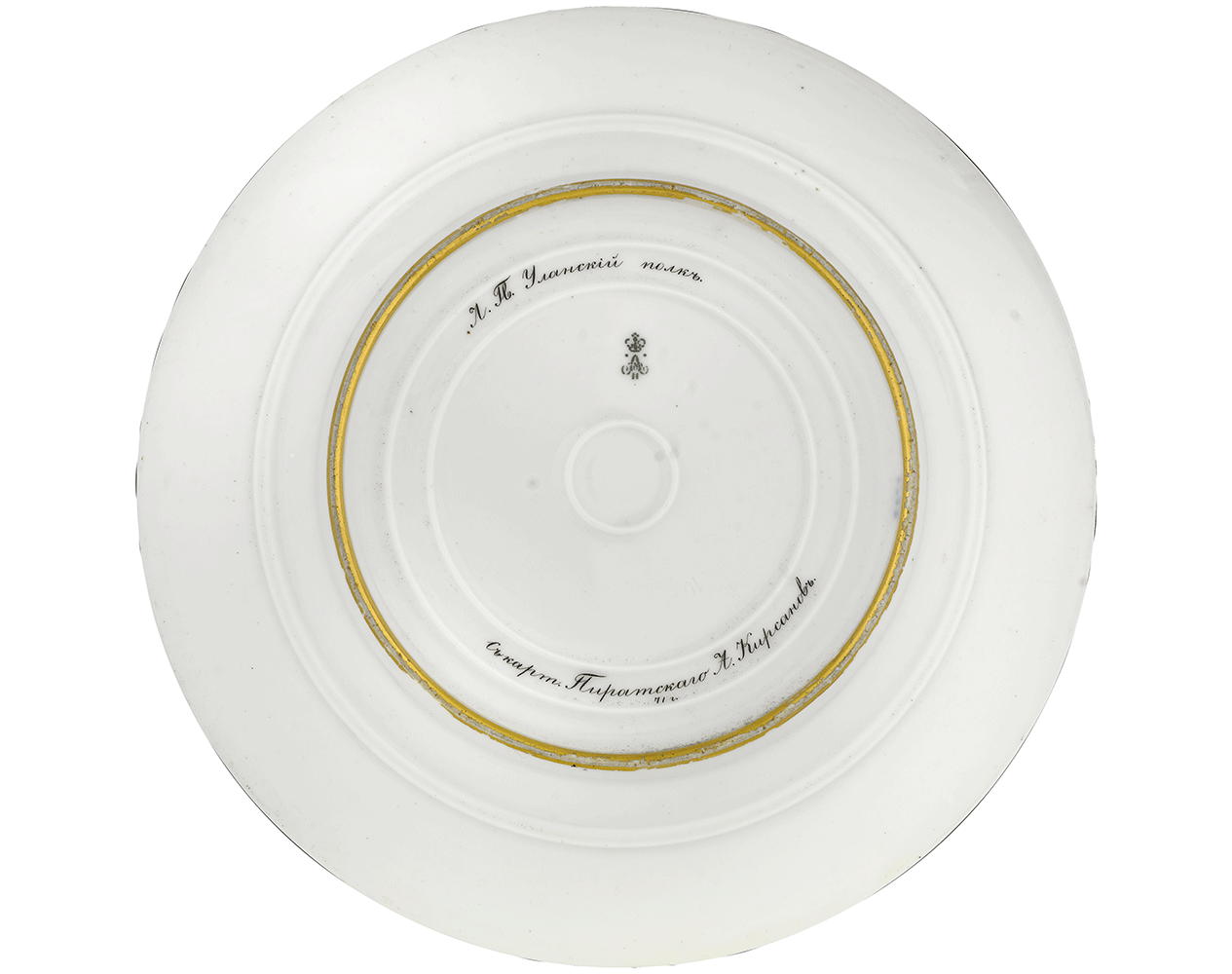 A circular porcelain military plate, the cavetto painted with troops of the Life-Guard Lancers Regiment by A.Kirsanov after a painting by Karl Piratsky within a gilt border, the rim decorated with a gilt ciselé laurel and oak leaf wreath on a mauve ground, the top of the plate decorated with a Russian double-headed eagle within a yellow reserve. The reverse inscribed in Italics in Russian: Л Гв Уланский полк / С карт Пиратского А.Кирсанов / 71 (Life-Guard Lancers Regiment / After a painting by Piratsky by A.Kirsanov / 71).