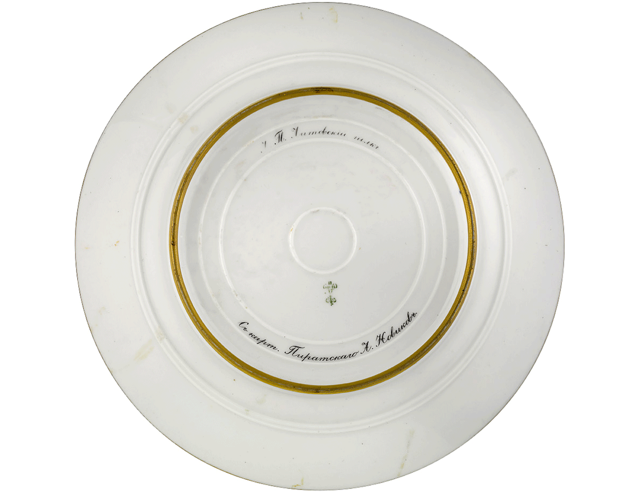 A circular porcelain military plate, the cavetto painted with troops of the Life-Guard Litovsky Regiment by Alexander Novikov after a painting by Karl Piratsky within a gilt border, the rim decorated with a gilt ciselé laurel and oak leaf wreath on a mauve ground, the top of the plate decorated with a Russian double-headed eagle within a yellow reserve. The reverse inscribed in Italics in Russian: Л Гв Литовский полк / С карт Пиратского А.Новиков (Life-Guard Litovsky Regiment / After a painting by Piratsky by A.Novikov).