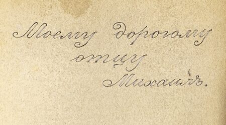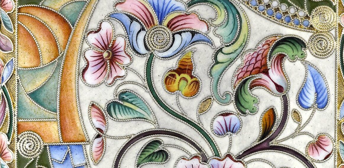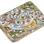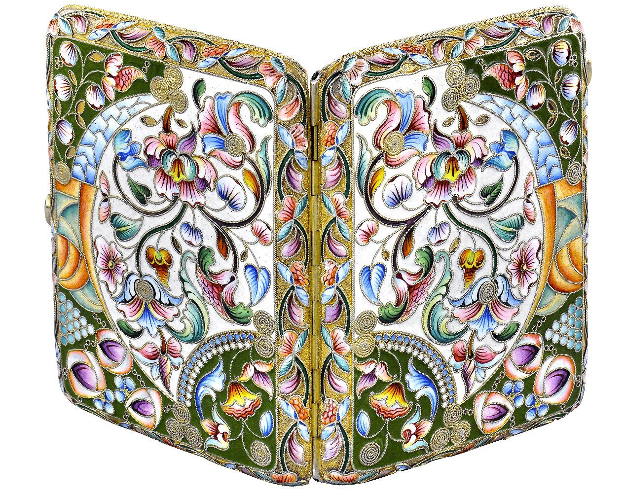 A silver-gilt and shaded cloisonné enamel cigarette case with shaped panels of scrolling flowers and foliage mainly in pink, blue and green hues on cream or olive ground. The inscription on the interior reads: ‘To my dear father, Mikhail‘.
