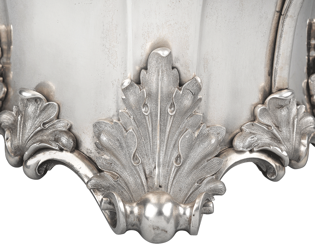 A silver vase-shape wine cooler (from a pair) from the Grand Duchess Olga Nicholayevna dowry service; one side of the tapering fluted body is engraved with the crowned monogram ‘ON’ in Cyrillic, the other with the Russian Imperial double-headed eagle; the handles are adorned with acanthus; the everted rims are cast with scrolling foliage and raised on four scroll feet headed by acanthus leaves.