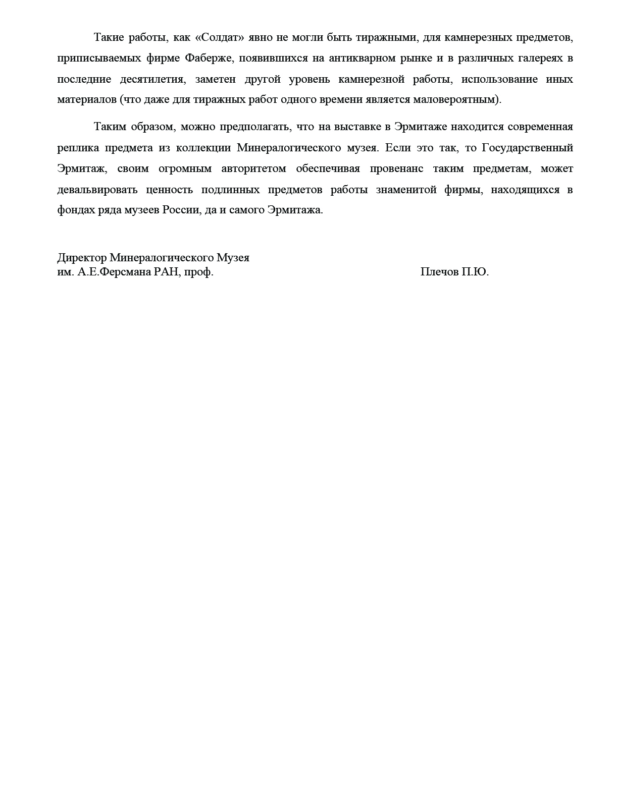 В заключение скажу, что в своем суждении о том, что фигурка солдата является подделкой, я не одинок. Мое мнение разделяют сотрудники Музея им. Ферсмана, неоднократно публично заявлявшие об этом, и чьи обращения к директору Эрмитажа были проигнорированы.