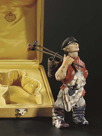 Во-первых, изготовление дубликатов противоречит самой специфике камнерезной скульптуры. Тиражной могла быть литая пластика, но не крайне трудоемкая в исполнении резная. В изготовлении человеческих фигурок использовались твердые, сложные в работе минералы. В сочетании с миниатюрным размером и обилием мелких деталей это делало создание скульптур кропотливым процессом, требовавшим высокого мастерства резчика. Во-вторых, фигурки людей никогда не были массовой продукцией, в отличие от запонок или портсигаров. По редкости они могли соперничать разве что с пасхальными яйцами. Вероятно, таких предметов было создано около пятидесяти, и все они были приобретены наиболее привилегированными клиентами фирмы (подробнее об этом см. H.C. Bainbridge, Peter Carl Fabergé, London, 1949, p. 111-114; A. von Solodkoff, Fabergé’s Hardstone Figures // Fabergé. Hofjuwelier der Zaren, Munich, 1986, p. 81-86; В. Скурлов, Т. Фаберже, В. Илюхин, К Фаберже и его продолжатели, Спб., 2009, стр. 94-103). Семь скульптур фигурирует среди покупок Николая II, шесть ныне известных предметов происходят из собрания Эммануила Нобеля; фигурки есть также в королевских коллекциях Таиланда и Великобритании.