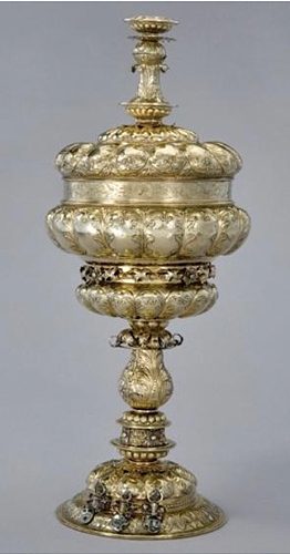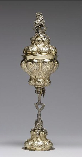 Such tall cups are not of Russian form but originated in western Europe during the Renaissance, when they were made from silver as a status of wealth, and placed on ceremonial display during banquets. An early example in the Berlin Kunstgewerbemuseum, 55cm (21½in) high, was made in 1538 in Lüneburg, which owed its 16th century prosperity to salt-mining and was almost as large as Hamburg (30 miles to the north-west).