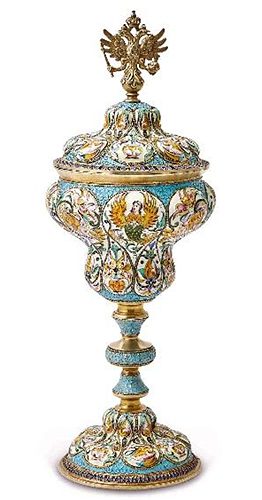 The Rückert cups auctioned in America were all topped by double-headed eagles, suggesting that they were commissioned as imperial gifts. Perhaps Nicholas II liked the design. Or was their popularity at his court down to his wife, Empress Alexandra, given that such cups originated in her native Germany in the 16 th century?