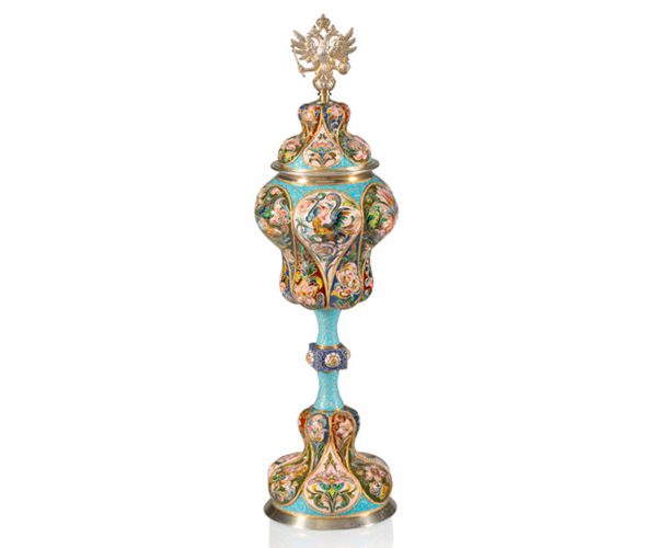 The distinctive use of cloisonné enamel gave these cups a distinctively Russian feel in the late 19th century, when they were invariably crowned with a double-headed eagle as finial. Rückert was not their only maker. Take the cup made in Moscow in 1895 (mark АЛ), 30.5cm (12in) high, sold by Doyle in New York for $28,800 on 23 May 2024 (Lot 612, est. $15-20,000) and catalogued as baluster-shaped, the domed foot and knopped stem, the body and cover with lobed reserves.